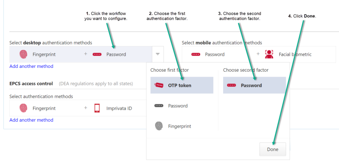 The following diagram illustrates modifying the default fingerprint plus password desktop authentication method for the E-prescribe controlled substances signing workflow. Clicking Add another method allows you to add another authentication method for that workflow.
