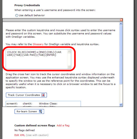 Sometimes Imprivata OneSign’s default method of proxying credentials does not match an application’s login process. Some applications do not use standard practices, implement proprietary technologies, or have custom workflows. For example, a password box may only appear after the user name has been validated. In these cases, the Customized Keystrokes and Mouse Clicks feature lets you reproduce the steps the user takes to manually enter credentials.