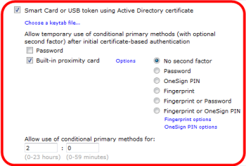 Conditional primary methods are primary authentication methods that can be used only under the condition that the user authenticated with the smart card within the allowed period.