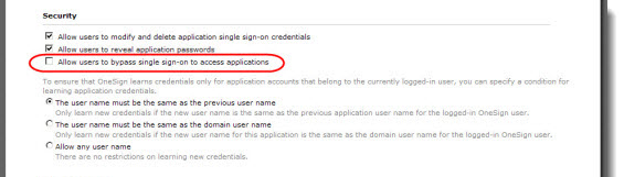 To prohibit users from bypassing SSO for this application, deselect the option as shown in the following image:
