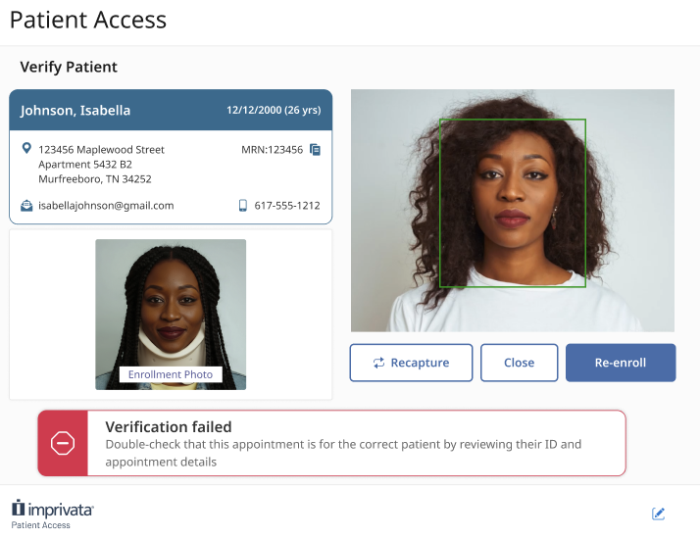 Imprivata Patient Access matches a patient’s photo to their medical record to improve patient safety, streamline registrar operations, and help reduce the number of duplicate records.