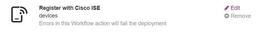 This action allows you to register devices with Cisco ISE. The Workflow action is run at the Launchpad. In case of a multi-phase deployment, it is run in the first phase.