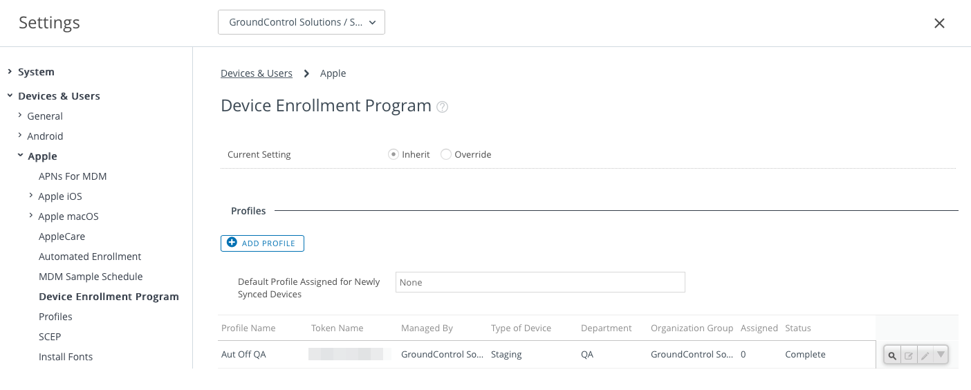 Log into the Workspace ONE Console and ensure you are viewing the correct organization group. Visit Devices > Devices Settings > Apple > Device Enrollment Program. One or more DEP profiles are listed.