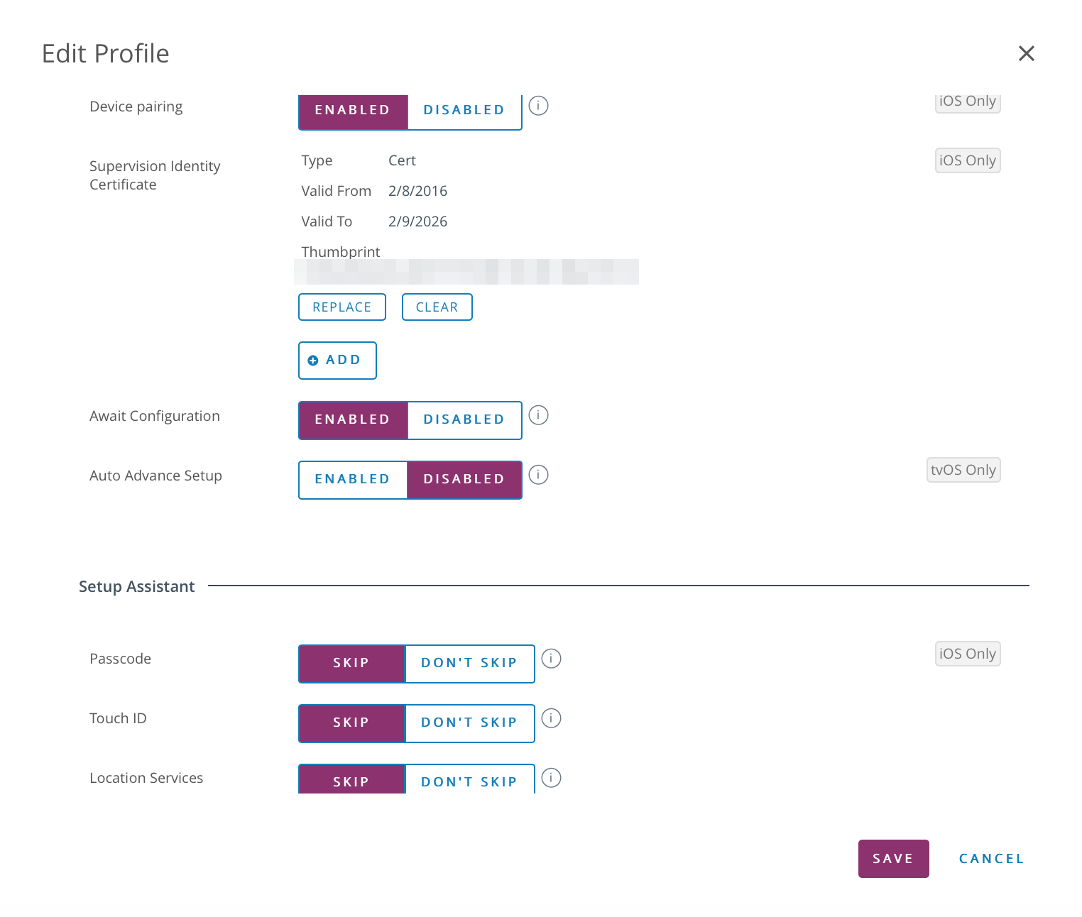 The Supervision Identity allows pairing with your iOS devices, even if the MDM DEP profile assigned to your devices does not allow pairing with other hosts. The option effectively secures devices while retaining management capabilities with Mobile Access Management.