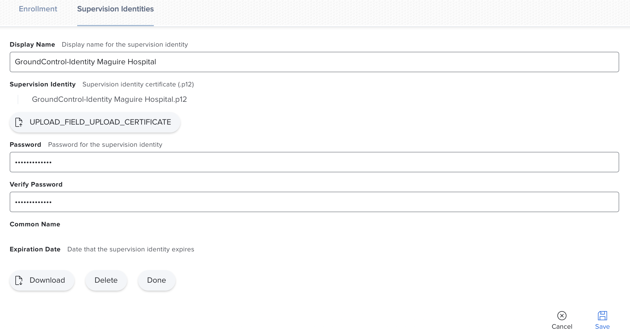 Under Supervision Identities, click Edit , then Upload. Upload the .p12 file provided by Imprivata support.