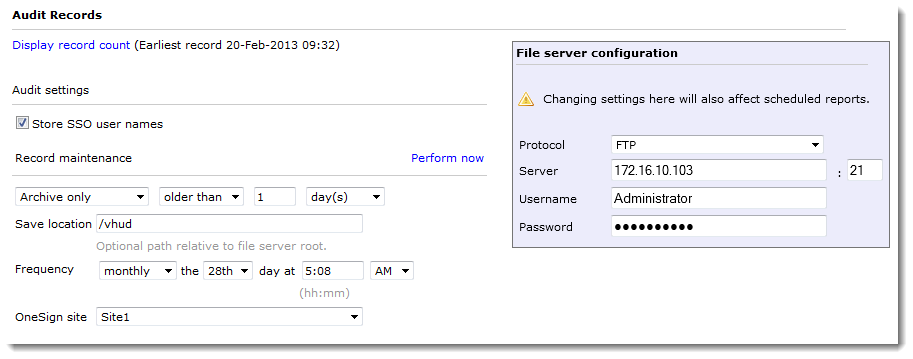 • The Record maintenance section, which allows you to archive and/or delete audit records and schedule audit log maintenance. See Maintaining Audit Records.