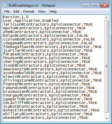 - username@domain,<APPLICATION>,<VALUE> where APPLICATION is the exact name of a profiled and deployed application and VALUE is TRUE to enable the application and FALSE to disable it.
