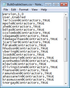 - username@domain,<VALUE> where VALUE is TRUE to enable the account and FALSE to disable the account.