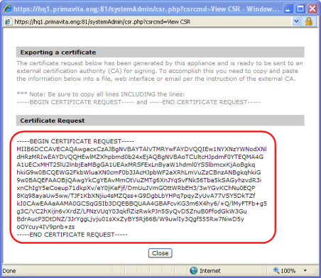 Log into the Imprivata Appliance Console. On the Security page > SSL tab, click View CSR to open a window with the text needed for the certificate request.