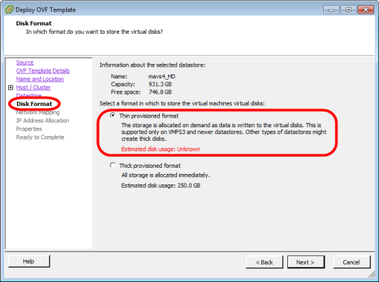 - Log into VMware vSphere Client and Create a new virtual machine as you would for a standard VM, but for Disk Format, select Thin provisioned format instead as shown in the following image: