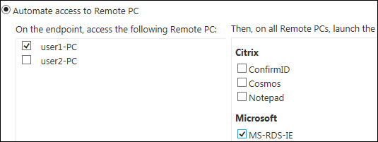 Enable access to desktops- Select Automate access to full VDI desktop > Microsoft. If additional applications are available to launch on the desktop, they appear in the right pane.