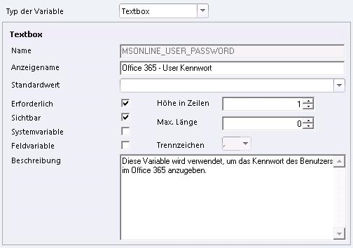 Die Variable Office 365 - User Kennwort (MSONLINE_USER_PASSWORD) wird verwendet, um das Kennwort des Benutzers im Office 365 anzugeben.