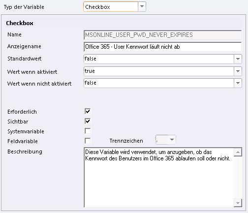 Die Variable Office 365 - User Kennwort läuft nicht ab (MSONLINE_USER_PWD_NEVER_EXPIRES) wird verwendet,um anzugeben, ob das Kennwort des Benutzers im Office 365 ablaufen soll oder nicht.