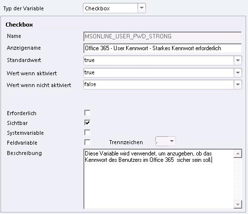 Die Variable Office 365 - User starkes Kennwort erforderlich (MSONLINE_USER_PWD_STRONG) wird verwendet, um anzugeben, ob das Kennwort des Benutzers im Office 365 sicher sein soll.