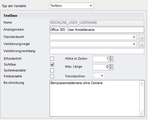 Die Variable Office 365 - Domäne (MSONLINE_DOMAIN) wird verwendet, um eine verifizierte Office 365 Domäne anzugeben. Die Domäne wird mit dem ausgewähltem User Anmeldenamen kombiniert.