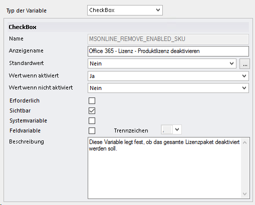 Die Variable Office 365 - Lizenz - Produktlizenz deaktivieren (MSONLINE_REMOVE_ENABLED_SKU) wird verwendet, um die ausgewählte aktive Produktlizenz zu deaktivieren.