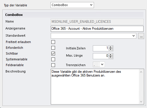 Die Variable Office 365 - Account - Aktive Produktlizenzen (MSONLINE_USER_ENABLED_LICENCES) wird verwendet, um eine dem Benutzer zugewiesene Office 365 Produktlizenz auszuwählen.