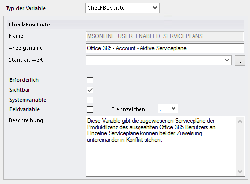 Die Variable Office 365 - Account - Aktive Servicepläne (MSONLINE_USER_ENABLED_SERVICEPLANS) wird verwendet, um einzelne oder mehrere aktive Servicepläne einer ausgewählten Produktlizenz auszuwählen.
