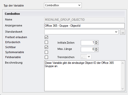 Die Variable Office 365 - Gruppe - ObjectId (MSONLINE_GROUP_OBJECTID) wird verwendet, um die eindeutige Object Id des Benutzers anzugeben, der aktiviert werden soll.