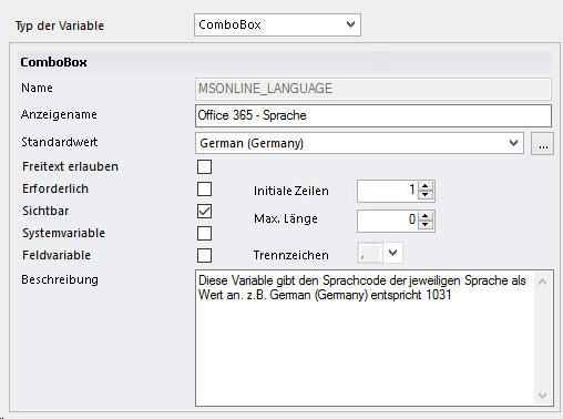 Die Variable Office 365 - Sprache (MSONLINE_LANGUAGE) wird verwendet, um die Sprache für die Regionaleinstellung festzulegen. Es werden die Codes der jeweiligen Sprachen als Wert übergeben.