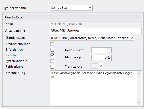 Die Variable Office 365 - Zeitzone (MSONLINE_TIMEZONE) wird verwendet, um die Zeitzone für die Regionaleinstellung festzulegen.