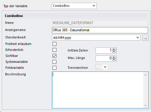 Die Variable Office 365 - Datumsformat (MSONLINE_DATEFORMAT) wird verwendet, um das Datumsformat für die Regionaleinstellung festzulegen.