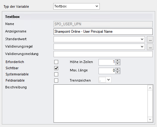 Die Variable Sharepoint Online - User Principal Name (SPO_USER_UPN) wird verwendet, um den User Principal Name des Sharpoint Online Benutzers anzugeben.