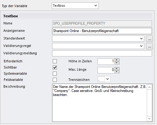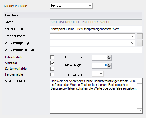 Die Variable Sharepoint Online - Benutzerprofileigenschaft (SPO_USERPROFILE_PROPERTY) wird verwendet, um den Namen der Benutzerprofileigenschaft einzugeben.