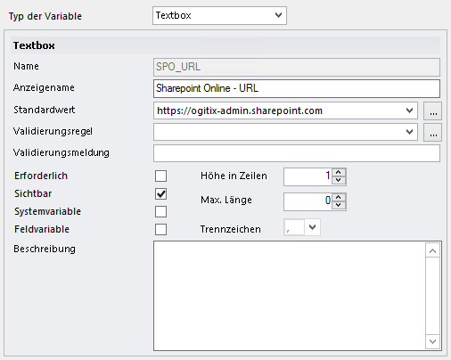 Die Variable Sharepoint Online - URL (SPO_URL) wird verwendet, um die URL der Sharpoint Online Administrationsinternetseite einzugeben.