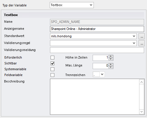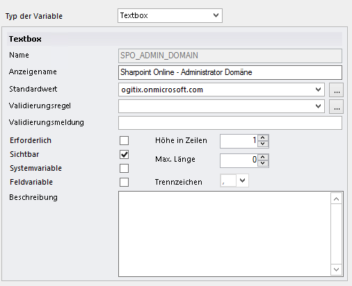 Die Variable Sharepoint Online - Administrator Domäne (SPO_ADMIN_DOMAIN) wird verwendet, um die Domäne für den Sharepoint Online Administrations-Benutzer anzugeben.