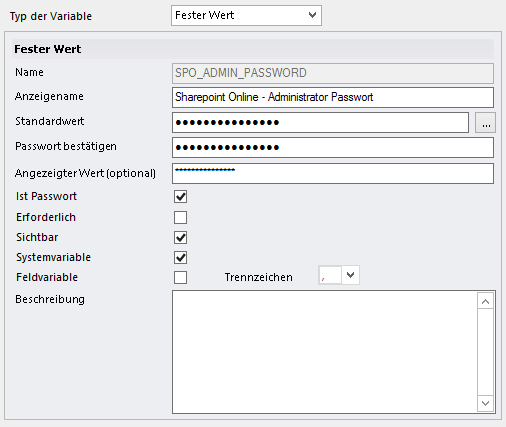 Die Variable Sharepoint Online - Administrator Passwort (SPO_ADMIN_PASSWORD) wird verwendet, um das Kennwort für den Sharepoint Online Administrations-Benutzer anzugeben.