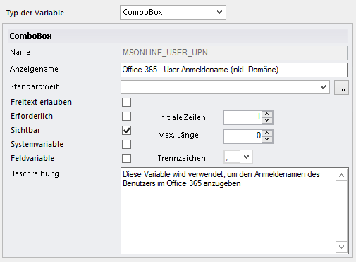 Die Variable Office 365 - User Anmeldename (inkl. Domäne) (MSONLINE_USER_UPN) wird verwendet, um den zu aktivierenden Benutzer anzugeben.