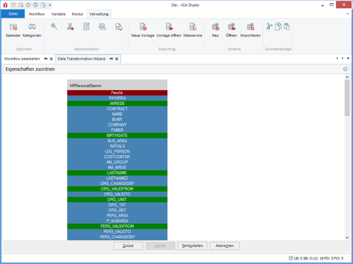 The columns from the data sources are assigned to the columns of the target data type here. Required columns that have not yet been assigned are displayed in red. Green columns are assigned. Blue columns are empty, but also optional.
