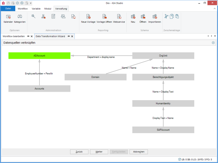 If more than one data source is defined, one data source must be defined as the primary data source (green). This is the data source over whose rows the loop runs. All other data sources are set to a suitable data record via the foreign key assignment or are empty.
