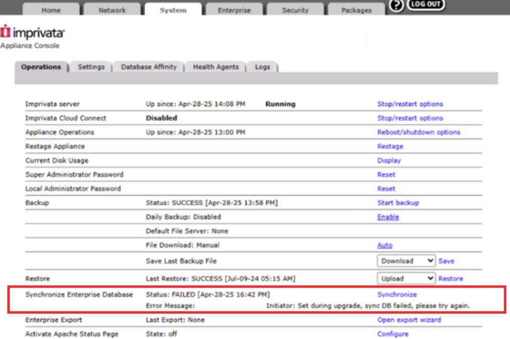 Collect the appliance logs and contact Imprivata Technical Support to resolve the issue and complete your upgrade.